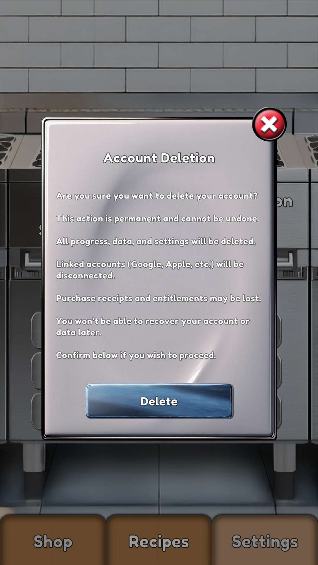 Deleting your account is a permanent action and cannot be undone. This will result in the complete removal of all game progress, saved data, personal settings, purchase history (including in-app purchase receipts and entitlements), and any linked accounts such as Google Play or Apple Game Center. Once deleted, the account and all associated data will be lost permanently and cannot be recovered. However, you will still be able to play the game again in the future by creating a new account and starting from the beginning. Please be sure you understand these consequences before continuing.